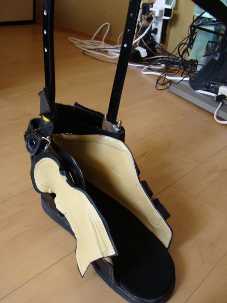 足部前面の開きがマジックベルトで固定できるように工夫されている。この工夫により一人で装具を装着できるようになった。この試作品は甲斐様ご自身の手によって作成された。