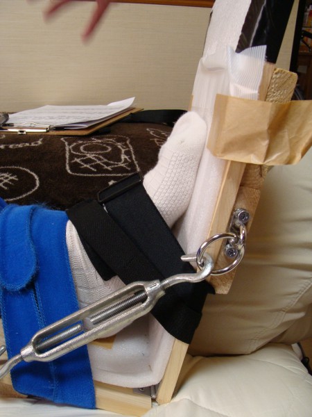麻痺側の足部が固くならないように伸ばすための機器。これも甲斐様ご自身により作成された。非常によく考えられた機器である。
